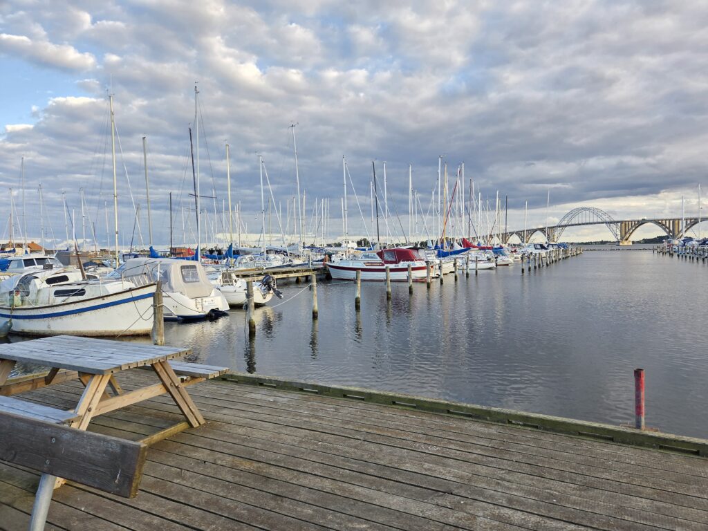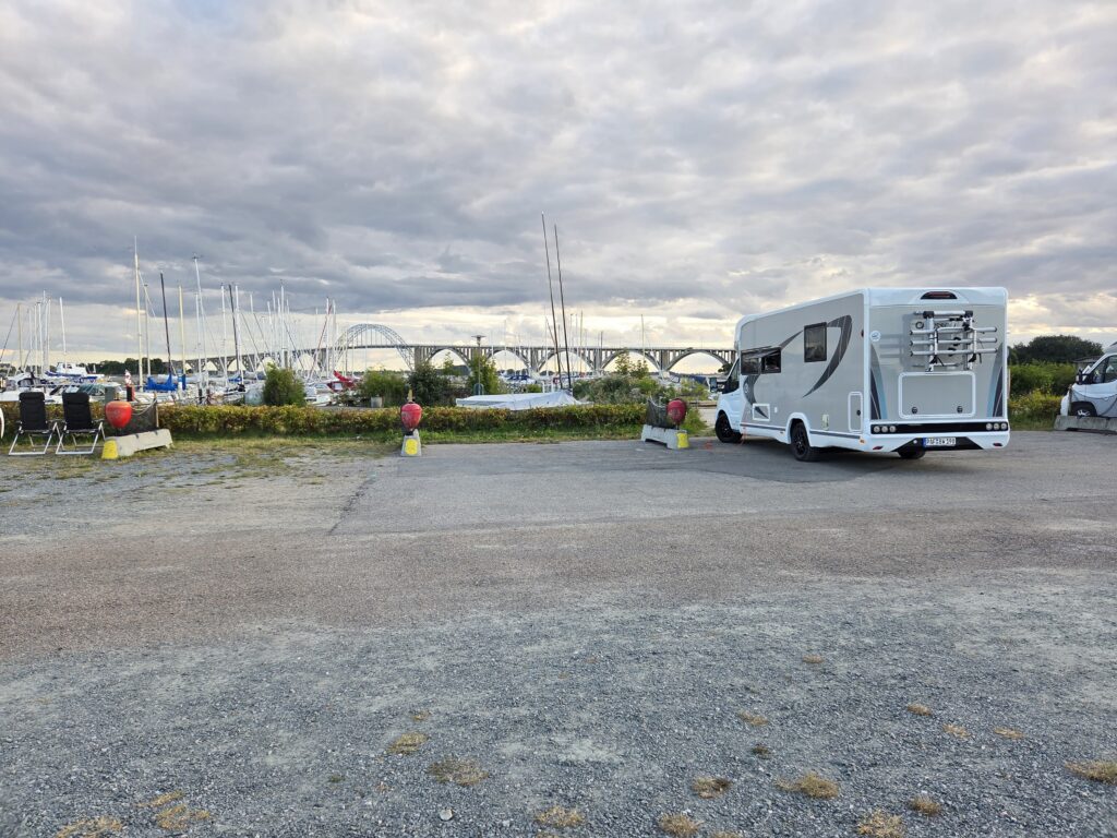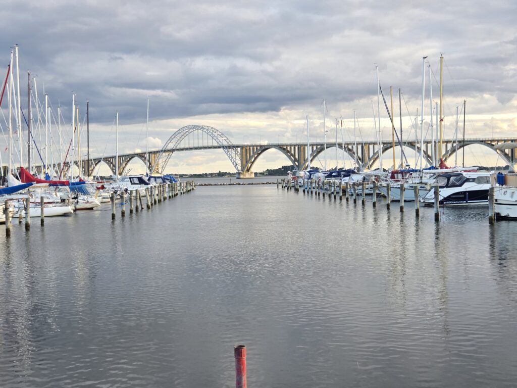 Nachdem die eigentlich im geheimen geplanten Standplätze in Stege beide voll waren, zum Glück im Nachhinein, fanden wir einen super Stellplatz in der Marina von Kalvehave. Für 220 DKK gab es Platz, Strom, saubere Toiletten und Duschen. Einen super Ausblick auf die Møn Brücke gab es oben drauf gratis dazu. Gleich gegenüber gab es einen Mini Supermarkt für die Brötchen am nächsten Tag.