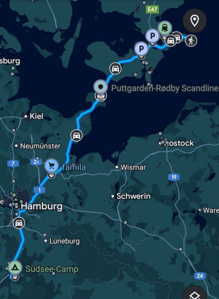 Donnerstag vormittags ging es dann vom Südsee Camp weiter Richtung Norden. An Hamburg vorbei, ausnahmsweise ohne große Verkehrsbehinderungen, weiter Richtung Lübeck. Nach kurzer Shopping Rast um neue Vorräte zu bunkern, ging es weiter Richtung Puttgarden auf Fähmarn.