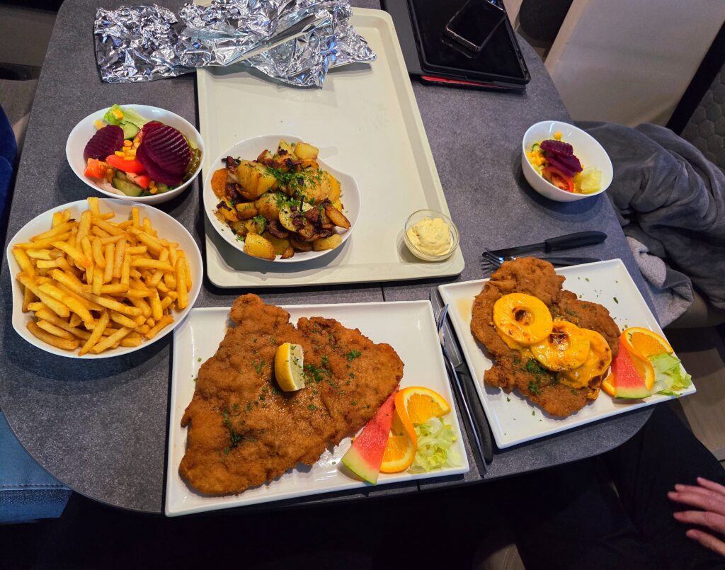Wir kamen zwar zu spät um einen Tisch zu ergattern, dafür bekamen wir aber 2 Schnitzel „To Go“ für den Camper auf Tablett und Geschirr serviert 😉 Ein nicht üblicher Service.
