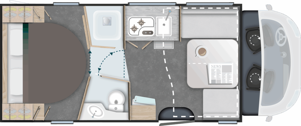 - Das Hauptbett längs in Fahrtrichtung, kein Klettern über den anderen hinweg.