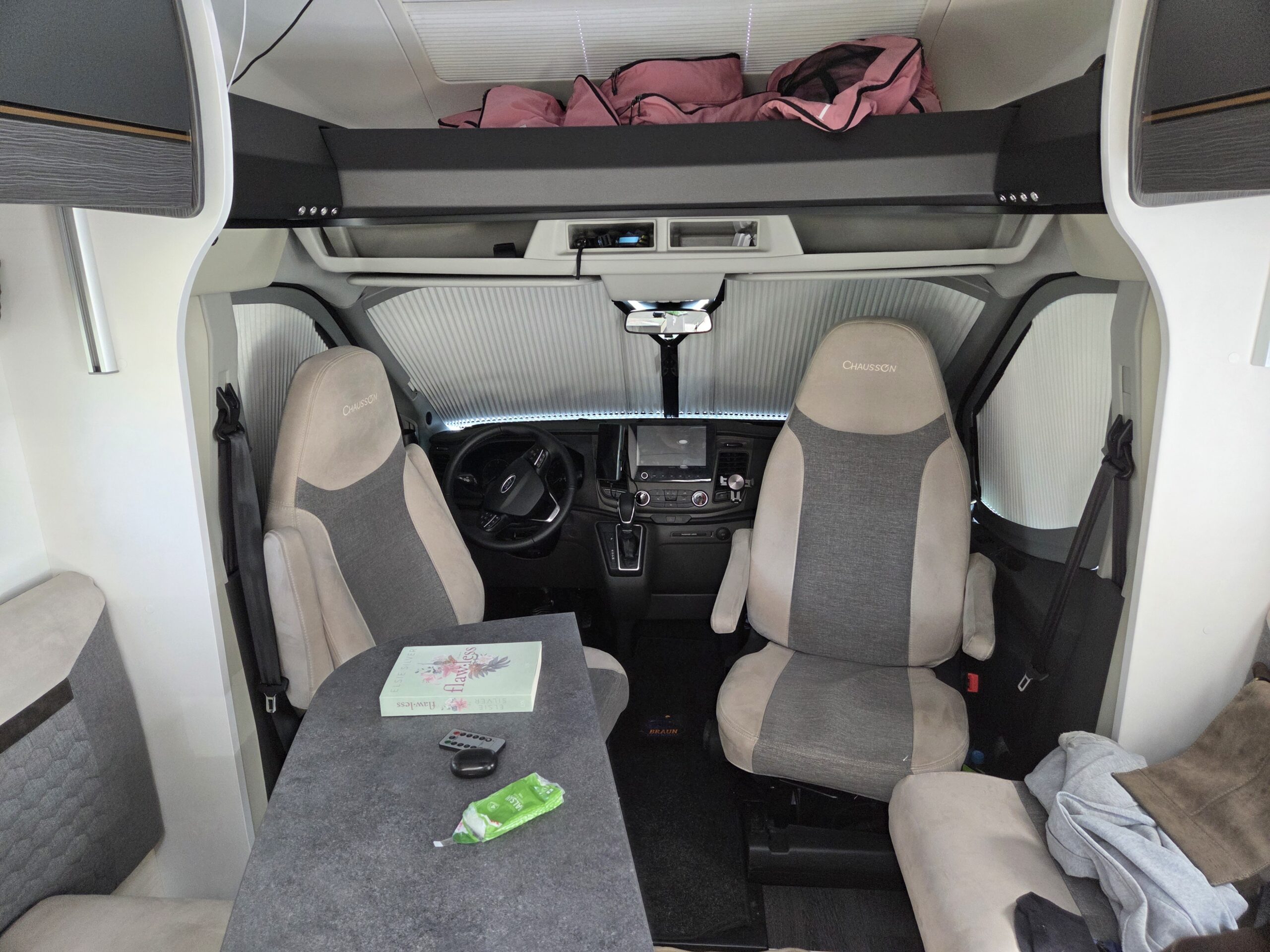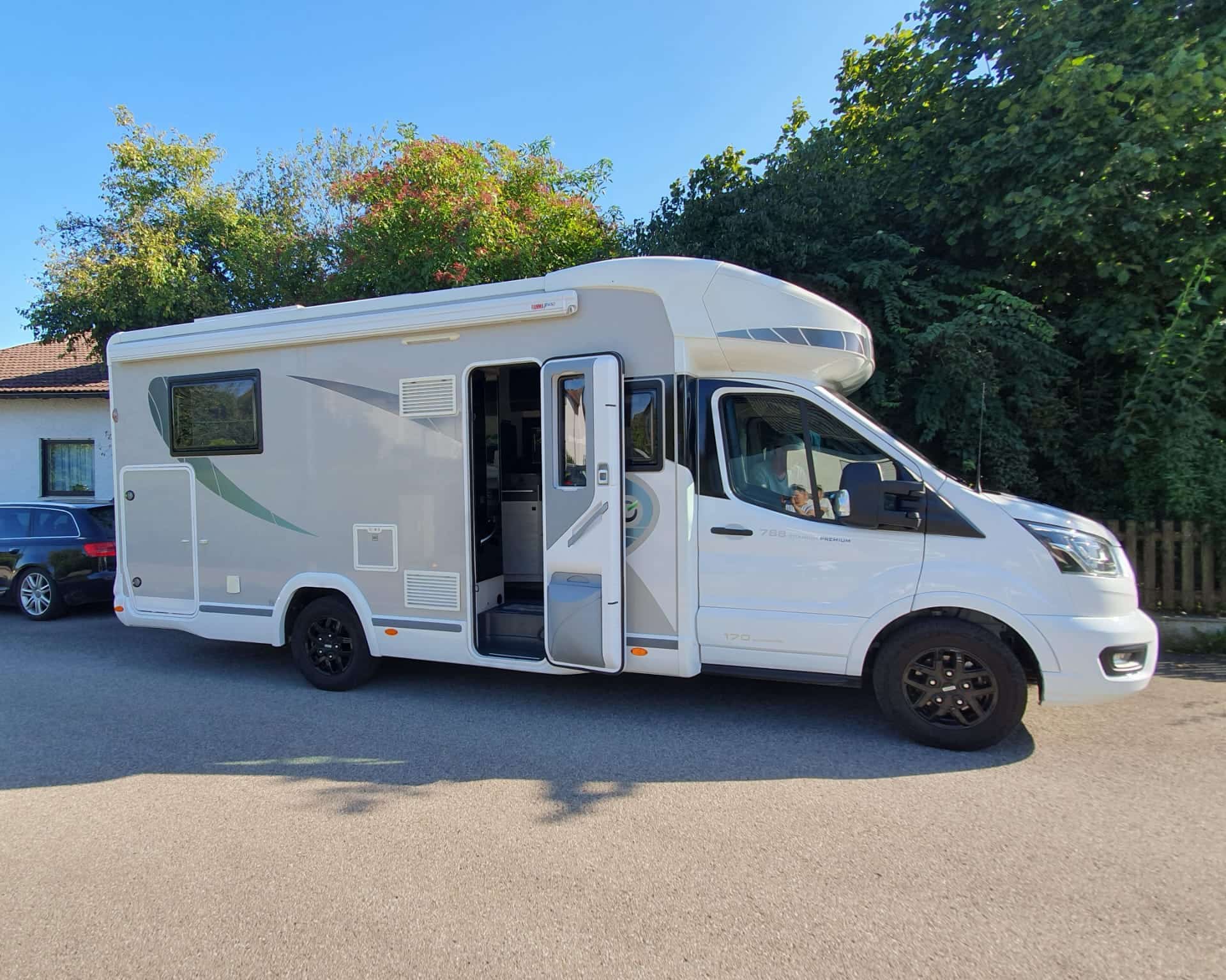 Schließlich wurde es ein Chausson 788 Titanium Premium mit knapp 7,20 m / 2, 35 m / 2,92 m. Also schon ne große Nummer im Vergleich zum Kastenwagen.. Der Teilintegrierte war noch recht neu mit knapp 20.000 km auf der Uhr.